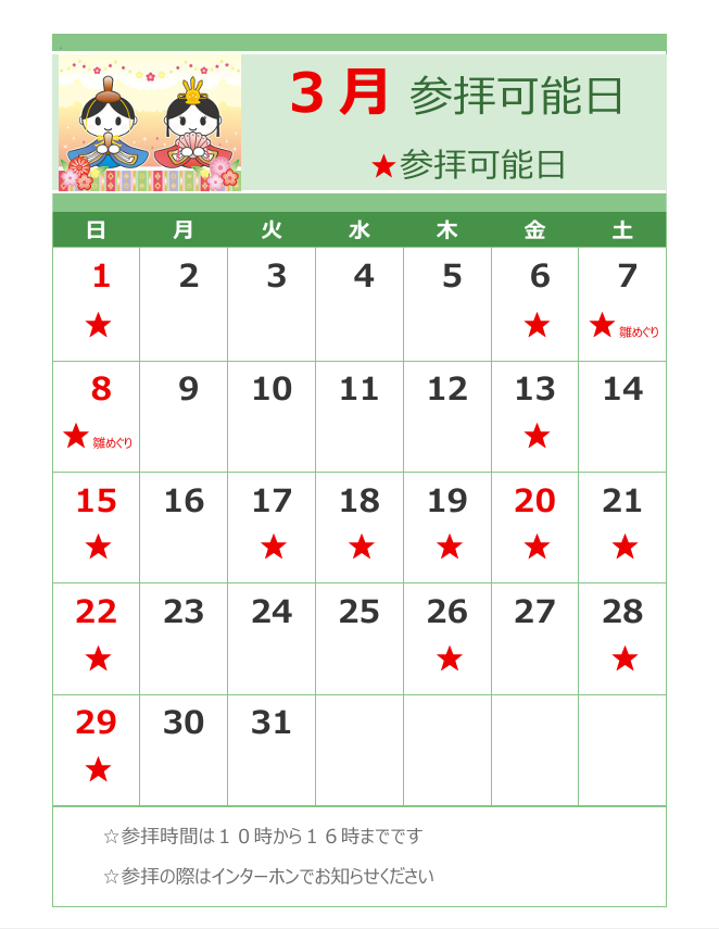 少し寒さも和らぎ過ごしやすい気候の富田林寺内町です。3月は3月7日(土)、8日(日)は「じないまち雛めぐり」も開催され、寺内町がたくさんのお雛様で華やかになります。 さて、3月の本堂参拝可能日のお知らせです。赤い★マークがついている日が参拝可能日です。10時から16時まで参拝可能です。拝観料は無料です。ぜひ春の装いの富田林寺内町と富田林興正寺にお越しください。お待ちしております。